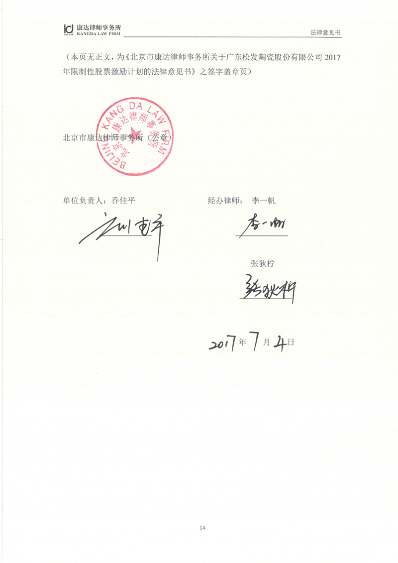 (本页无正文,为《北京市康达律师事务所关于广东松发陶瓷股份有限公司2017年限制性股票激励计划的法律意见书》之签字盖章页)